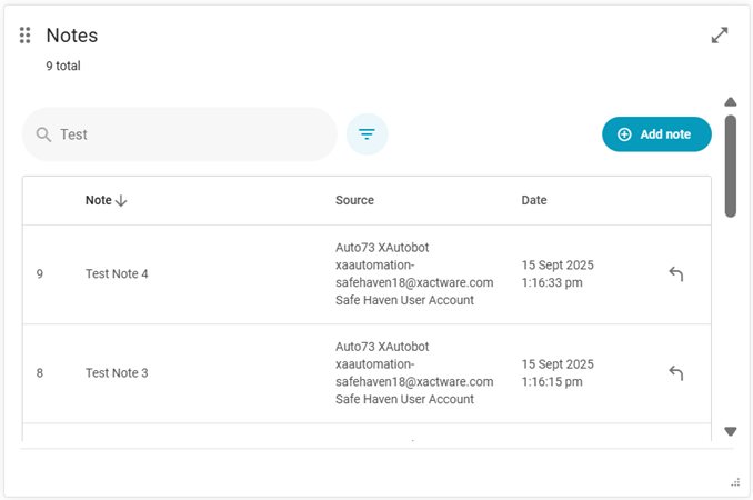 Using the search bar in the Notes widget, you can search your notes by their content or by the person who added them.