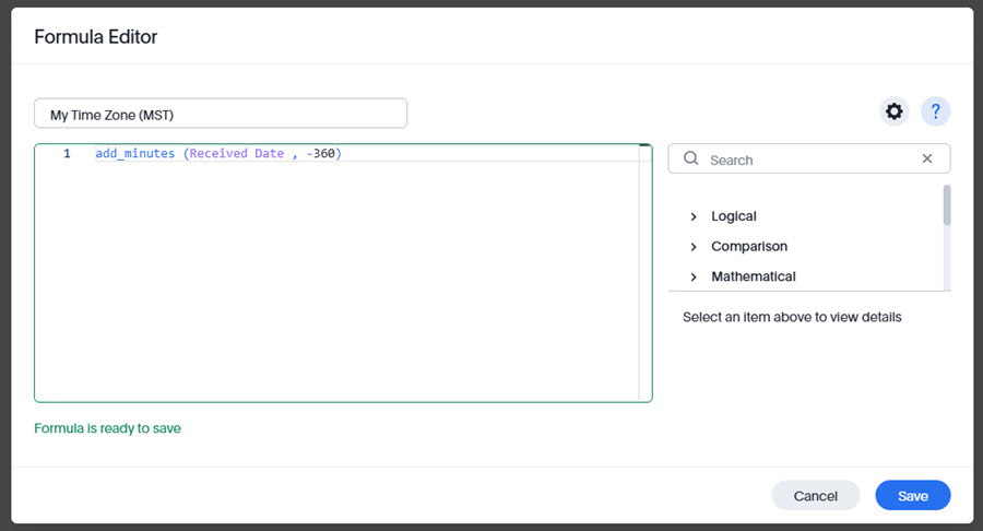 - Input the following formula: add_minutes (Received Date , -360)