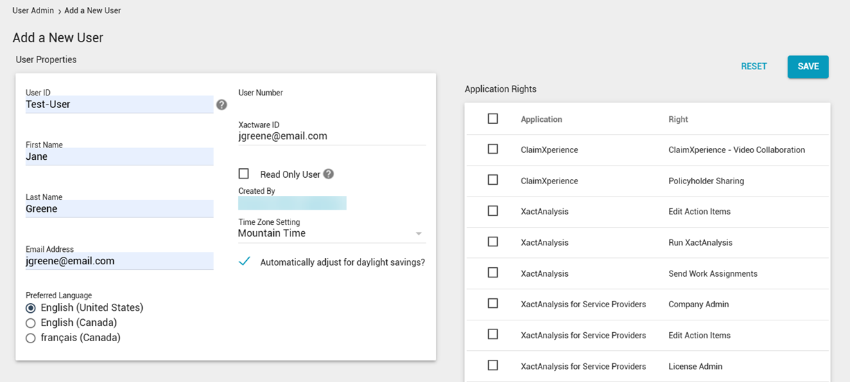 - Xactware ID: The Xactware ID must be an email address (preferably the user's primary email address) and must be unique across all XactAnalysis users. If you enter an Xactware ID that matches the new user's existing Xactware ID, when you click Save the user receives an email instructing them to link their Xactware ID to the new account. The email includes a link to the XactAnalysis login page. For more information about linking users, see the Xactware ID Help.