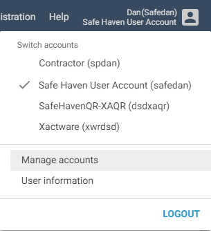 - To link more accounts, click your name in the upper-right corner of XactAnalysis and select Manage Accounts. This returns you to the landing page where you can link or unlink more accounts.