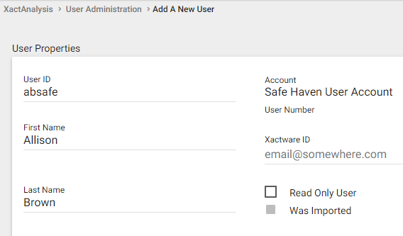 - If you enter an Xactware ID that matches the new user’s existing Xactware ID, when you click Save the user receives an email instructing them to link their Xactware ID to the new account. The email includes a link to the XactAnalysis login page.