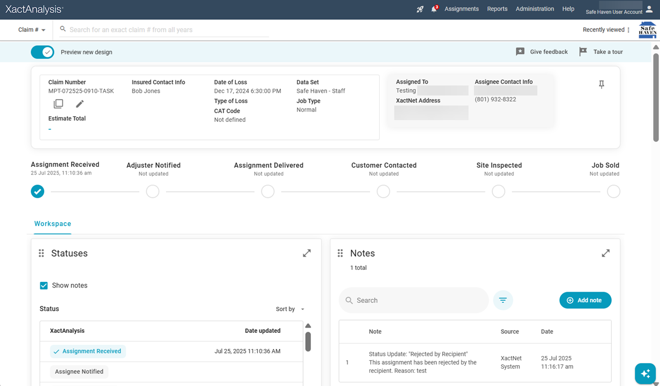 The Assignment Detail page is a record of an assignment and the work done to accomplish it. From here, you can easily find the claim number, estimate total, contact information, type of loss, coverage details, notes or comments, current statuses, and more.