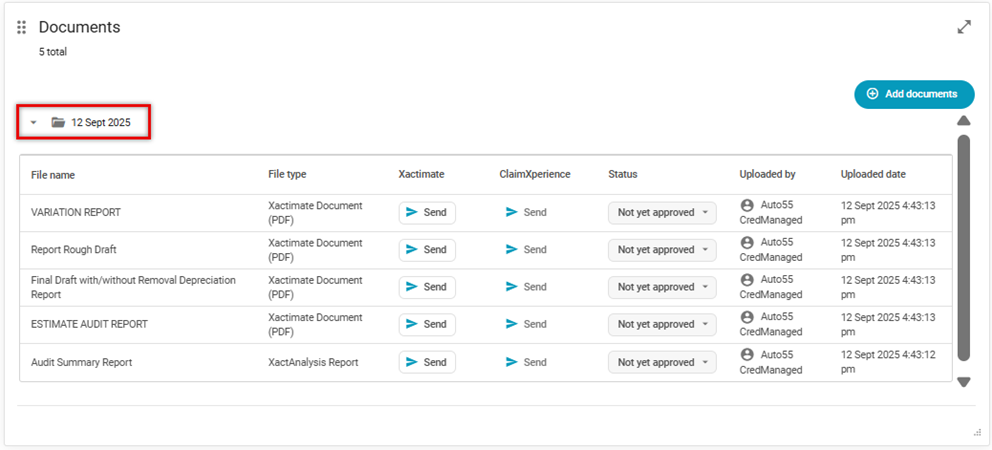 In the Documents widget, you can view and add documents, change their status, and send them to Xactimate or ClaimXperience.