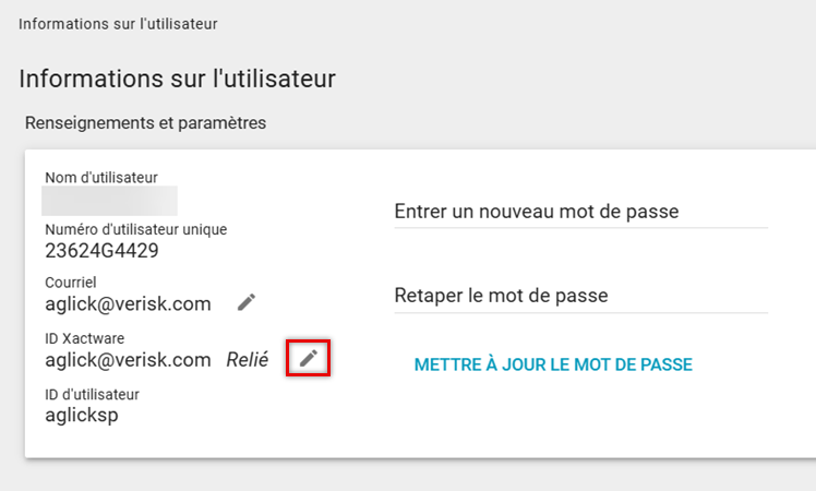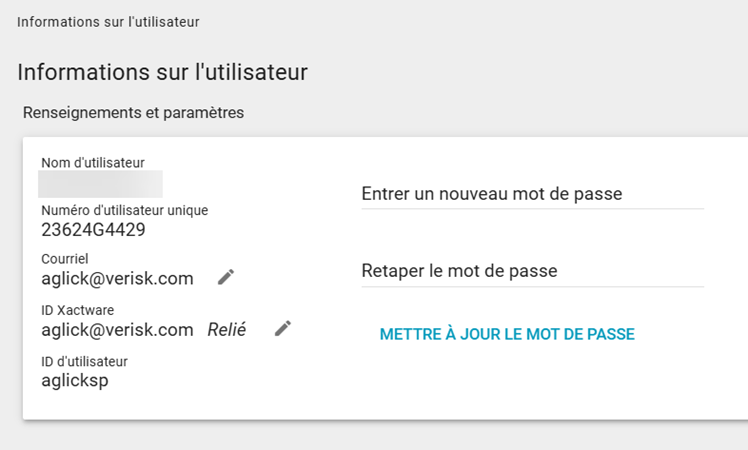 - Sur la page identifiant Xactware, modifiez l’un des éléments suivants : identifiant Xactware, prénom, nom de famille, numéro de téléphone, autre adresse courriel ou mot de passe.