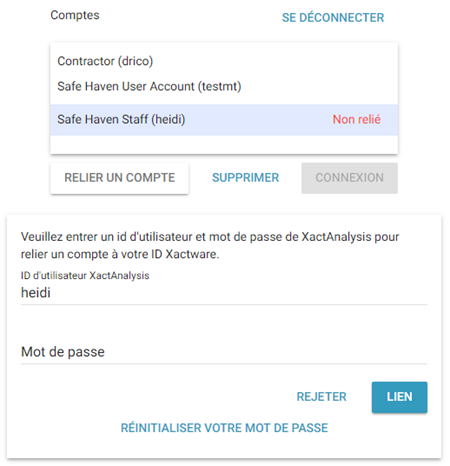 1. Dans les champs qui s’affichent ci-dessous, saisissez votre identifiant utilisateur et votre mot de passe XactAnalysis pour le compte, puis cliquez sur Lier. Le compte n’est plus marqué comme « non lié » dans la zone Comptes.