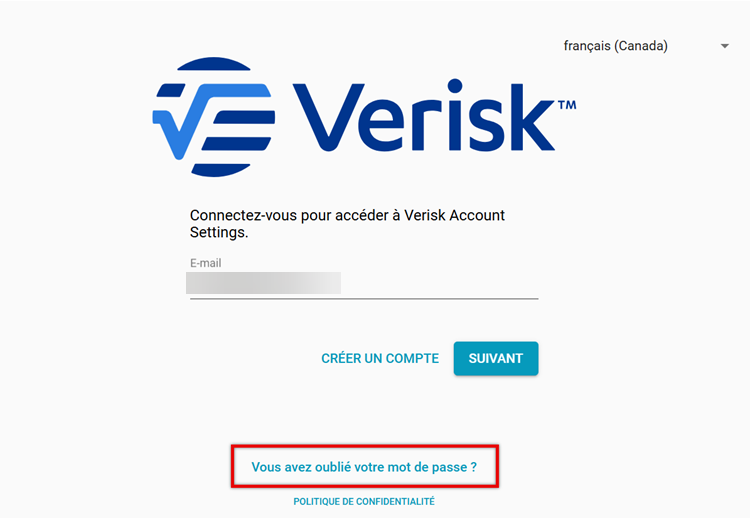 2. Cliquez sur RÉINITIALISER LE MOT DE PASSE. Un courriel sera envoyé à partir de noreply@ssomail.verisk.com à l’adresse courriel principale avec pour objet Réinitialisation du mot de passe.