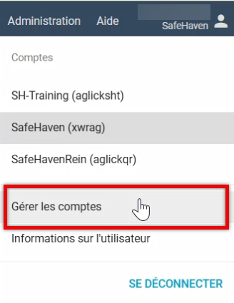 1. Pour lier d’autres comptes, cliquez sur votre nom dans le coin supérieur droit de XactAnalysis et sélectionnez Gérer les comptes. Vous revenez à la page d’accueil où vous pouvez lier ou dissocier d’autres comptes.