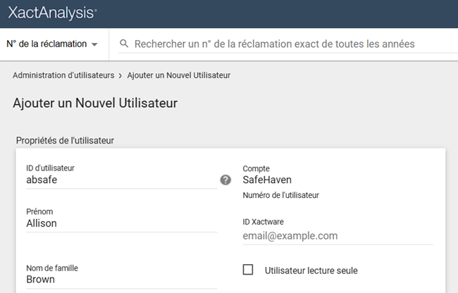 • Dans Administration des utilisateurs, sur la page Ajouter un nouvel utilisateur, entrez les informations du compte, y compris un identifiant Xactware, puis cliquez sur Enregistrer.