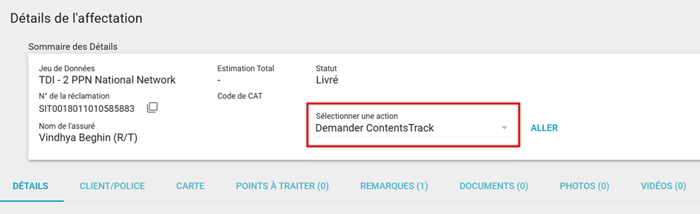 - Dans Détails de l’affectation, sélectionnez Demander ContentsTrack dans le menu Choisir une action et cliquez sur ALLER.