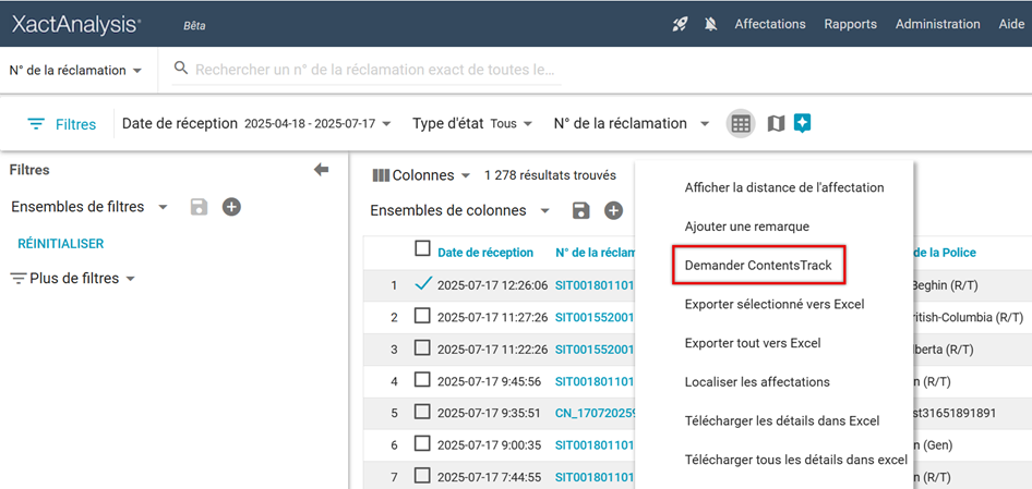ContentsTrack™ est une application conçue pour documenter et suivre les articles d’inventaire d’un emballage. Lorsque vous êtes dans XactAnalysis, vous pouvez demander une affectation ContentsTrack à partir des détails de l’affectation ou de la recherche.