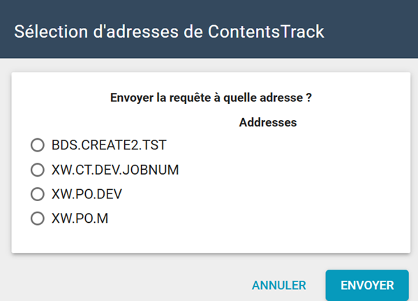 - La boîte de dialogue Sélection des adresses ContentsTrack s’affiche. Sélectionnez l’adresse XactNet du compte ContentsTrack souhaité.
