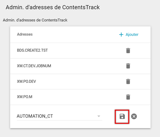- La page Administration des adresses ContentsTrack se chargera, et vous pourrez ajouter ou supprimer les adresses XactNet des comptes ContentsTrack.