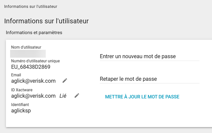 - Sur la page Identifiant Xactware, modifiez l'un des éléments suivants : Identifiant Xactware, Prénom, Nom, Numéro de téléphone, Adresse électronique alternative ou Mot de passe.