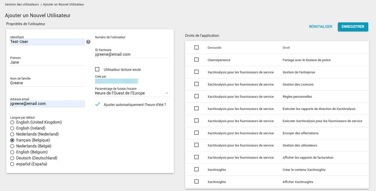 ID Xactware: L'ID Xactware (IDentifiant Xactware) doit être une adresse email (de préférence l'adresse email principale de l'utilisateur) et doit être unique pour chaque utilisateur de XactAnalysis. Si vous entrez un ID Xactware correspondant à un ID Xactware déjà existant, lorsque vous cliquez sur Enregistrer, l'utilisateur reçoit un email lui proposant de lier son ID Xactware au nouveau compte. L'email inclut un lien vers la page de connexion XactAnalysis..