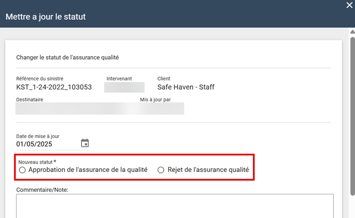Auparavant, si votre compte nécessitait le champ Nouveau statut lorsque les utilisateurs mettaient à jour les statuts AQ et Client, les options AQ approuvé ou Client approuvé étaient automatiquement sélectionnées par défaut. Dans cette version, nous avons ajouté une nouvelle option où vous pouvez demander à vos utilisateurs de sélectionner manuellement le nouveau statut lorsqu’ils mettent à jour les statuts AQ ou Client.