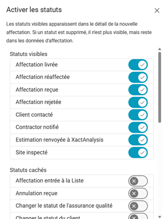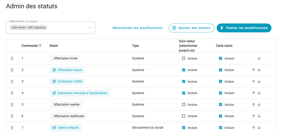 Nous continuons d’enrichir et d’améliorer la nouvelle page Détails de l’affectation ! Pour cette version, nous avons ajouté une nouvelle page, Admin des statuts, qui vous permet de contrôler les statuts qui apparaissent dans le nouveau suivi de statut du Détail de l'affectation. Il est possible de sélectionner jusqu’à six statuts à afficher dans le suivi des statuts et de définir leur ordre d’apparition.