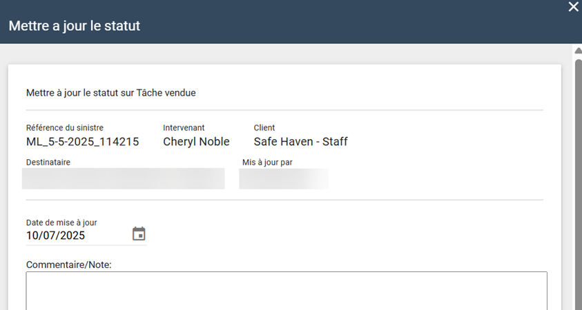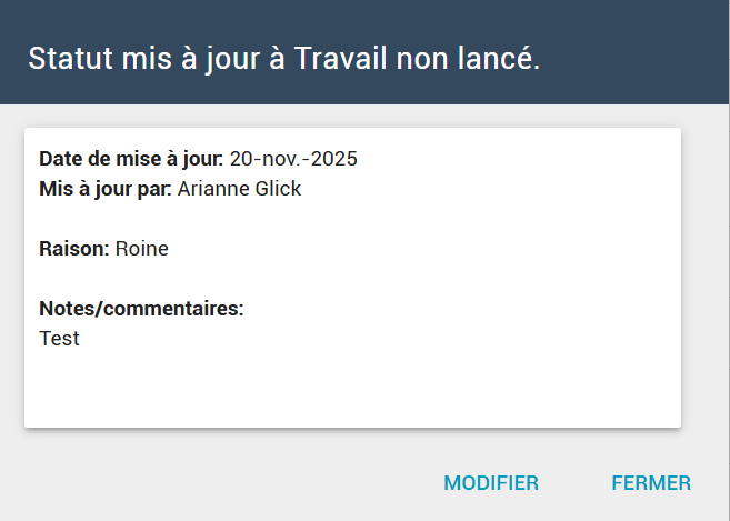 Chaque fois que ce statut est mis à jour, XactAnalysis enregistre la mise à jour et l'affiche sur la page Détail de l'affectation.