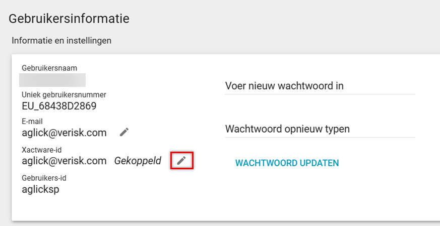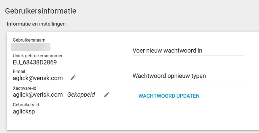1. Wijzig op de pagina Xactware-ID een van de volgende opties: Xactware-ID, Voornaam, Achternaam, Telefoonnummer, Alternatief e-mailadres of Wachtwoord.