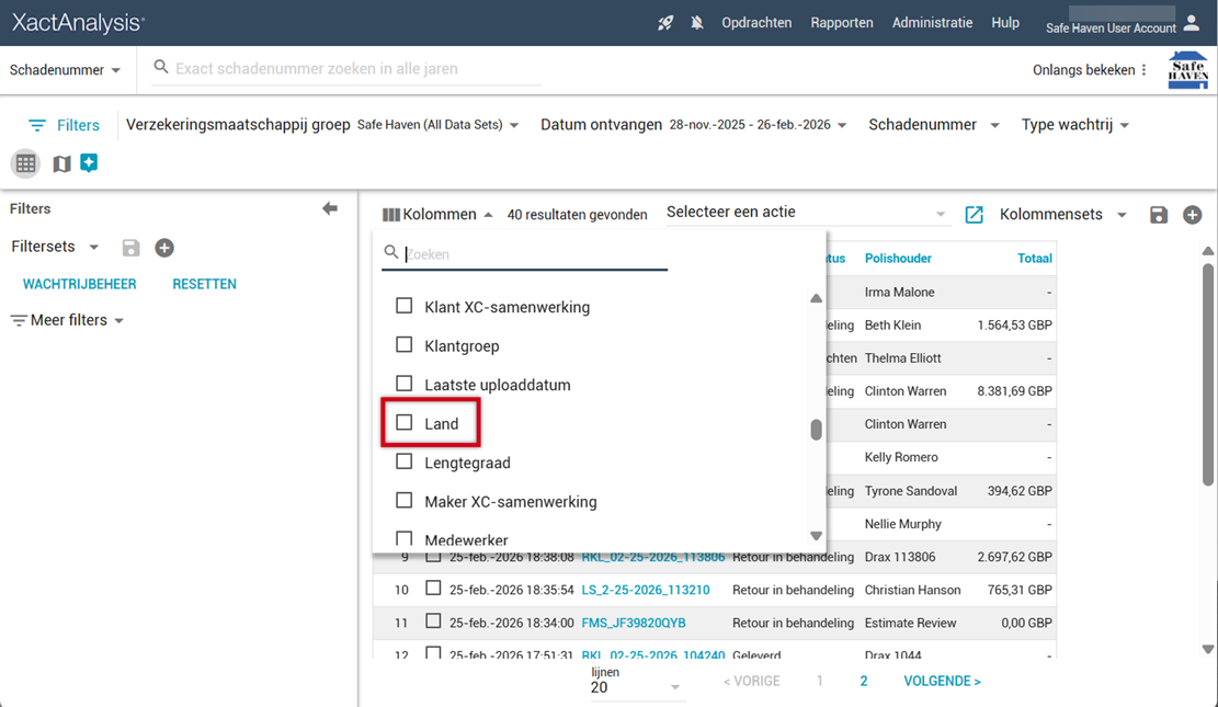 We hebben een nieuwe kolom Land toegevoegd! Het toont het land van de risicolocatie en vult andere zoekkolommen aan, zoals Plaats, Provincie en Postcode.